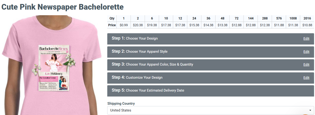 After locking in the style, decide on the apparel color, size, and the quantity that suits your group.