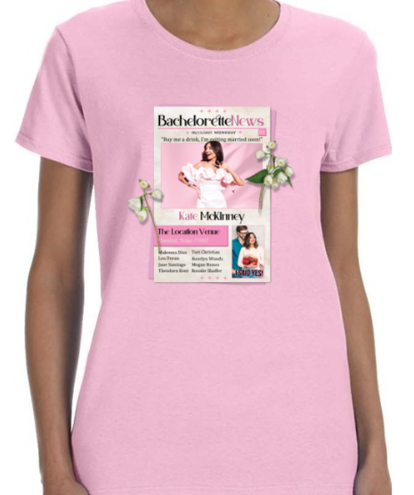The “Cute Pink Newspaper” design captures attention with its playful use of headlines and layout, making it one of the cutest bachelorette shirts for a fun-loving squad. It has a youthful and energetic personality, making it easy to pair with accessories like bubbly drinks or playful props during photos. Bridesmaids can wear it again in casual settings, as its print carries a cool balance of humor and style that feels timeless.