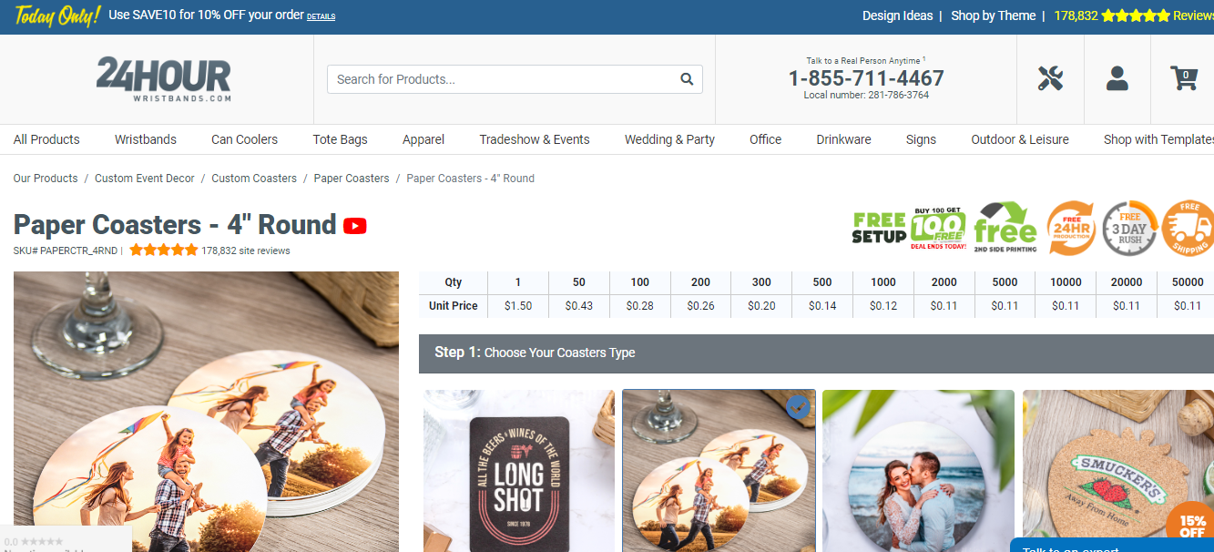 Our paper coasters are manufactured with 16pt of glossy paper stock. We offer color printing for all our coasters. They can be imprinted with 1 to full imprint color. You can even choose different designs for each side.