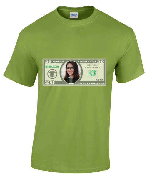 This novelty shirt design allows businesses to insert a custom photo into a stylized $20‑bill. It’s memorable and conversation‑worthy—particularly effective for marketing firms, real estate agencies, or financial service businesses wanting a creative twist. It signals creativity and brand awareness with a patriotic backdrop.