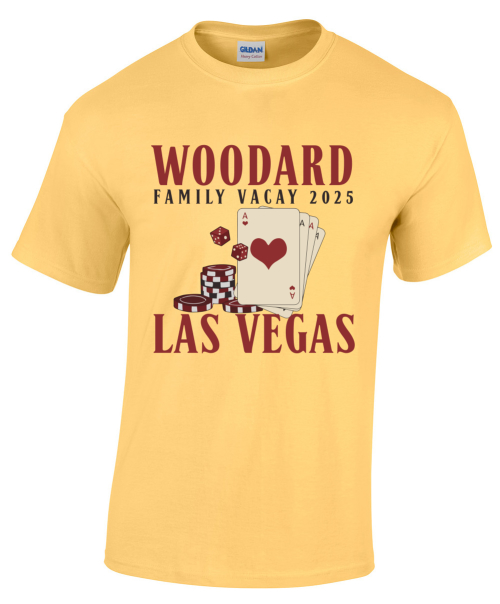 Designed for gatherings in or inspired by Las Vegas, this style uses a familiar sign motif to make your shirts instantly recognizable. Customize it with your event date, family name, and location. Bright reds, yellows, and blues give it a bold look, but you can also adapt the colors to fit your preference. You can pick different shirt models and fabric types to match the climate and comfort needs of your group.