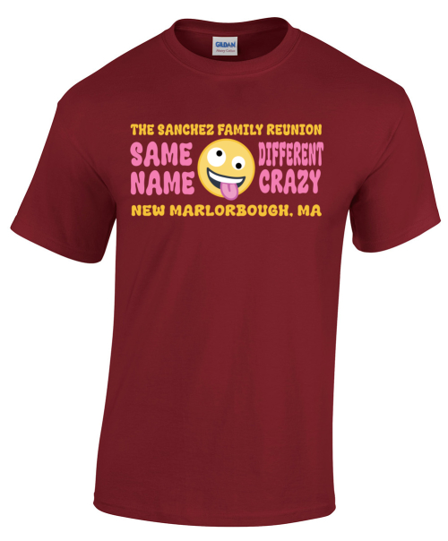For a lighthearted reunion shirt, this design uses emoji-style graphics to show humor about having the same last name but different personalities. You can customize the text to fit your family’s sense of humor, pick from multiple shirt colors, and adjust the emoji tones. The easy customization tool lets you click through options and work on the final layout until it looks right for your group.