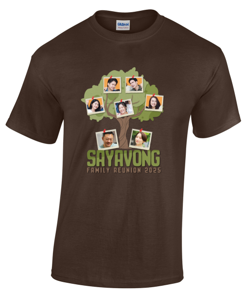 Featuring a tree with strong roots, this design highlights the idea of shared history. You can add your family name, reunion year, and location. The artwork works well on both bright and neutral shirts, allowing you to match the overall event color scheme. Select from various print options, find the size range you need, and check the price before you confirm your purchase.