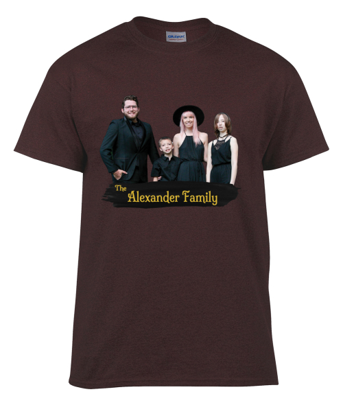 For a reunion with a more formal or unique theme, a gothic-inspired frame can make a custom family photo stand out. You can upload your own image, customize the text, and select a color that works best with the photo. The design offers flexibility in placement, so you can work with the layout until it looks right. This style works well when you want to create a special keepsake shirt that goes beyond standard reunion designs.