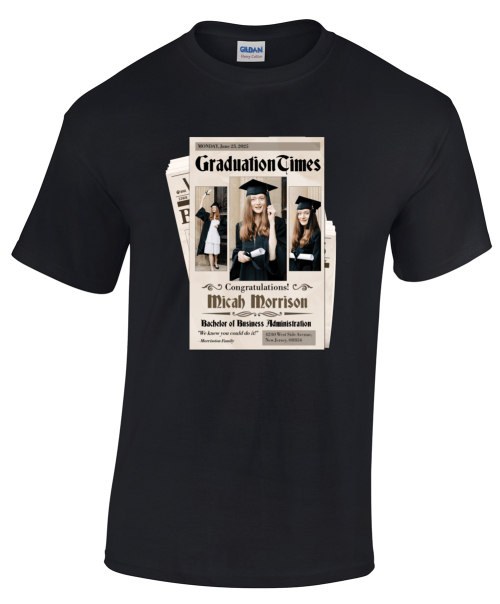 A newspaper-style concept that turns graduation day into front-page news. The design includes bold headlines such as “Class of 2025 Conquers the Times,” and subtext like “Breaking: Graduate navigates life’s pages with purpose.” Supporting shirts might say “Featured Column: Proud Parent” or “Supporter in Print.” Optional QR codes or faux barcodes create a clever nod to digital navigation and interaction.