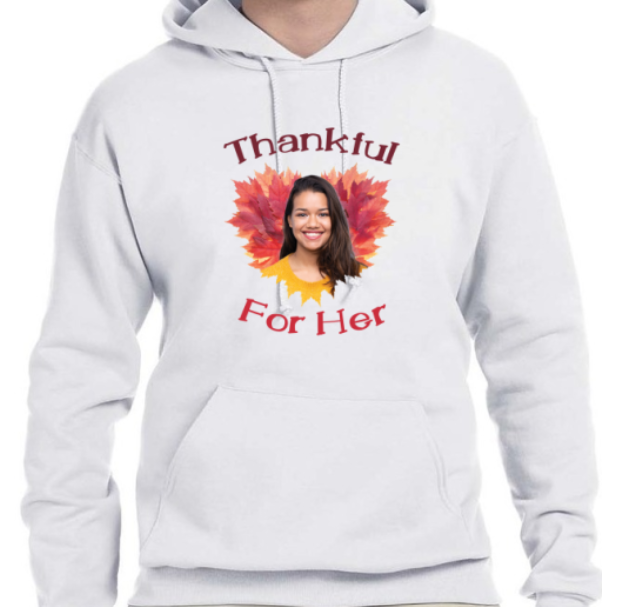 With warm tones and a heart-shaped design surrounded by leaves, this hoodie emphasizes gratitude and love. Families can add a custom photo to make it a personal tribute to shared memories and moments of thankfulness.